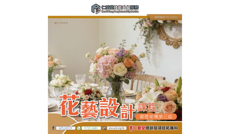 上課日期:2026年2月28日 至11月 時間:上午10時00分 至 下午6時00分 (中間一小時午休) 地點:觀塘成業街7號寧晉中心16樓1及4室 (仁愛堂專業培訓中心(九龍東)) 對象:有意成為花藝師或計劃從事花藝行業,並希望考取花藝專業證書專業資格的人士。 收費:$38,000 (另需自費花材,約$23,000) 備註:如有興趣報讀可先報名,隨後會有職員與您聯絡課程詳情