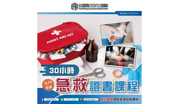 上課日期:2026年3月7、14、21、28日 (逢星期六) 【考試:4月11日】 時間:上午9時00分 至 下午5時30分 (共30小時) 地點:屯門啟民徑18號仁愛堂賽馬會社區及體育中心2樓「仁愛堂賽馬會職涯發展及創業支援中心」 入學要求 : 1) 十八歲或以上人士 (小六程度或以上) 2) 懷孕期女士不適合報讀 收費:$750 (包括行政、證書、急救課程手冊、繃帶包) ***仁愛堂員工可享額外優惠*** *收費如有更改,恕不另行通知*